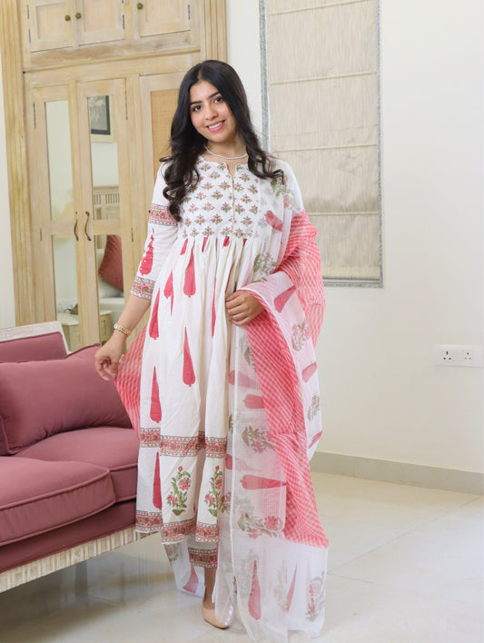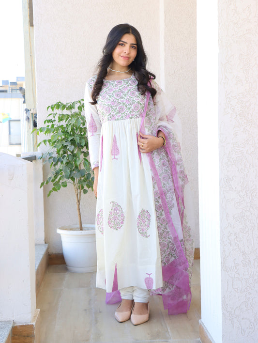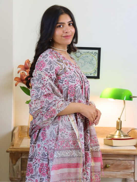 Pink and Gray Hibiscus Gathered A-Line Kurta Set