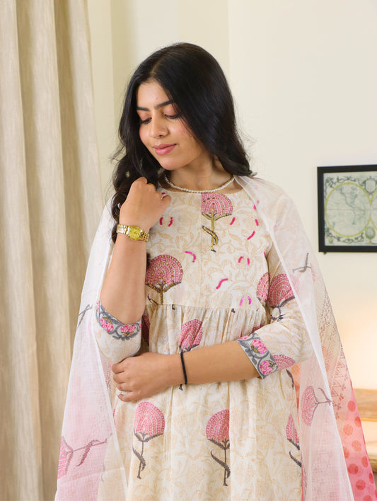 Peonies and Lotus Gathered Fit and Flare Kurta Set with Side Slits