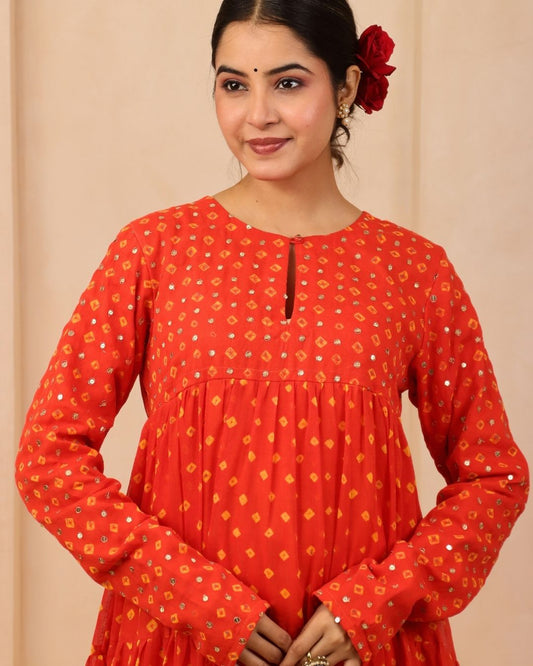 Hiteshwari - Orange Bandhani Hand Embroidered Tiered Anarkali Mulmul Suit - Set of 3