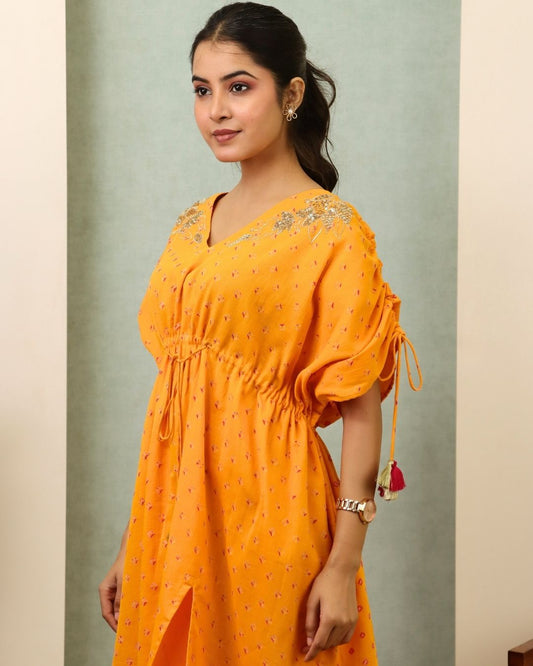 Jyotsana - Yellow Bandhani Hand Embroidered Kaftan Co-ord - Set of 2
